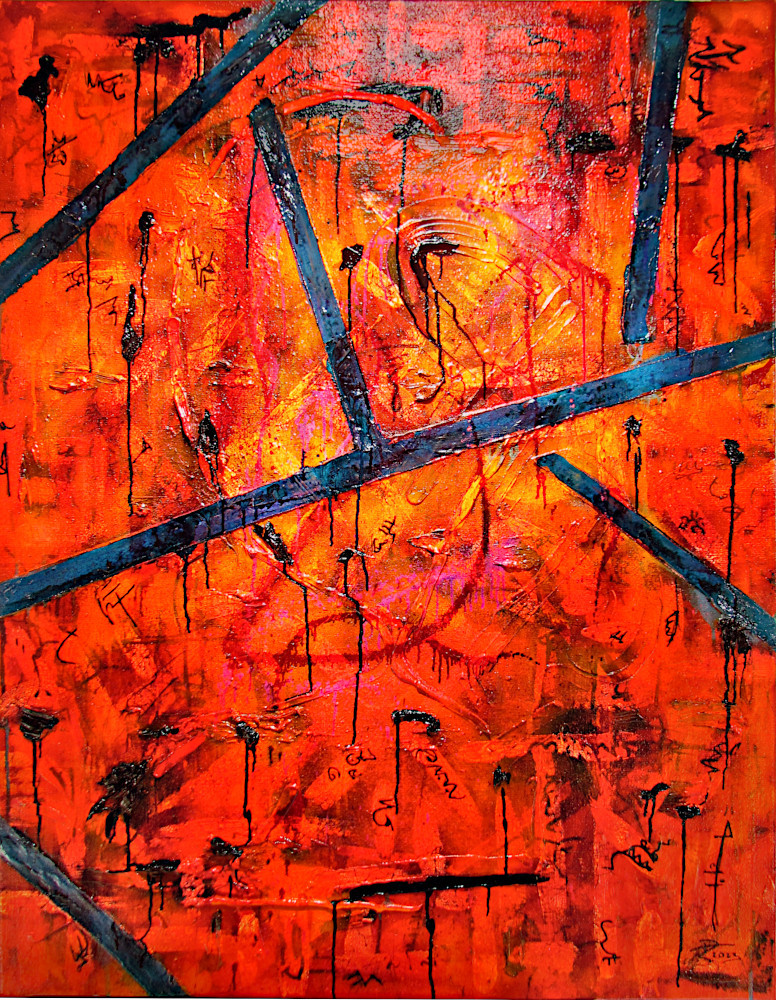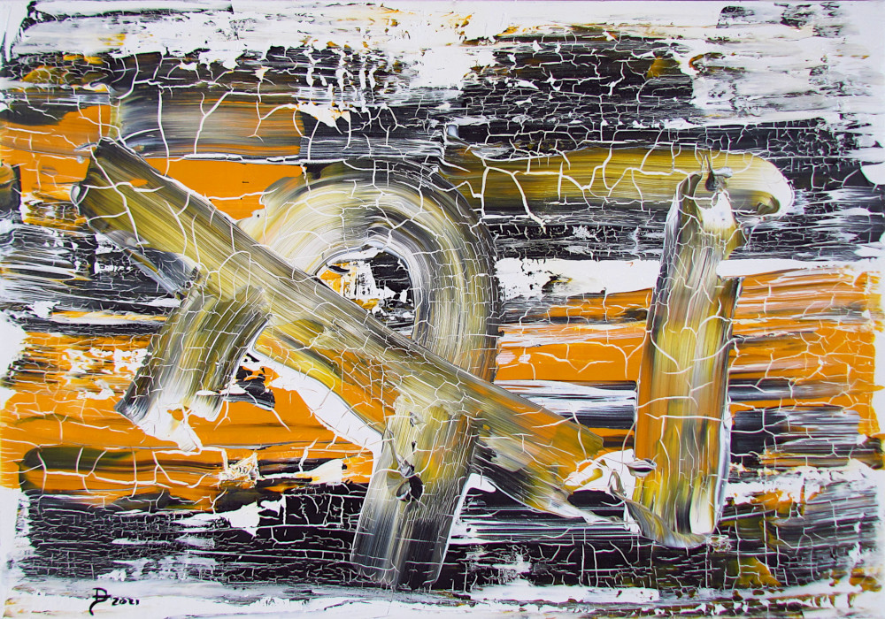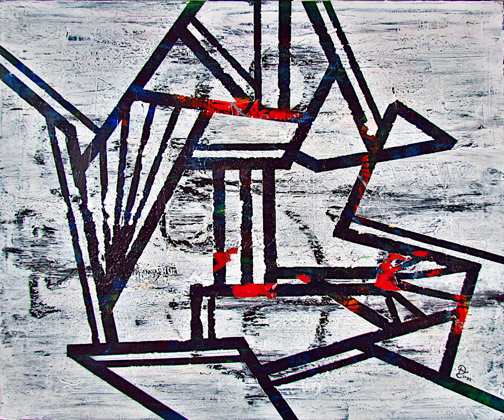 unter anderem Ölfarben, Acrylfarben, Kohle und Kunstharz entstehen dichte Texturen und Kontraste. Linien erscheinen als Grenzen, sie zerlegen und formen neue Strukturen, die sowohl Ordnung als